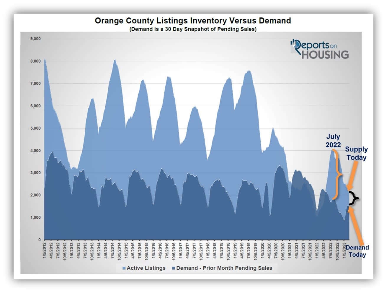 - Distressed homes, both short sales and foreclosures combined, comprised only 0.5% of all listings and 0.1% of demand. Only four foreclosures and six short sales are available today in all of Orange County, with ten total distressed homes on the active market, unchanged from two weeks ago. Last year there were three total distressed homes on the market, similar to today.