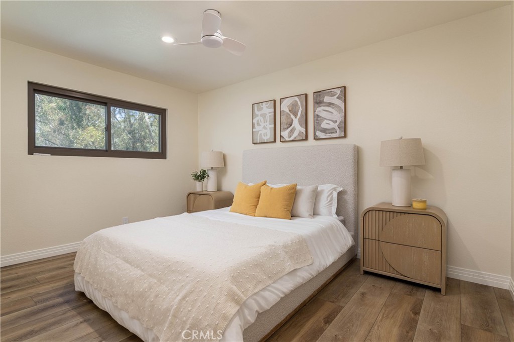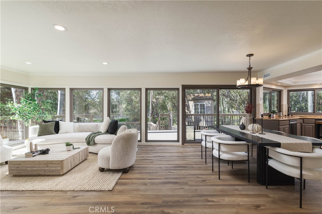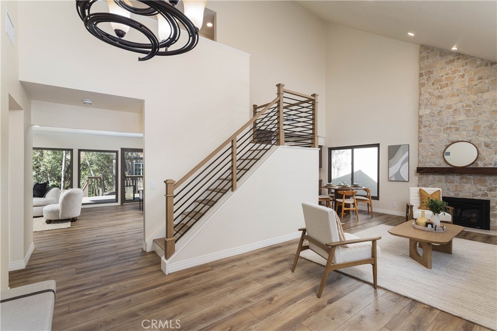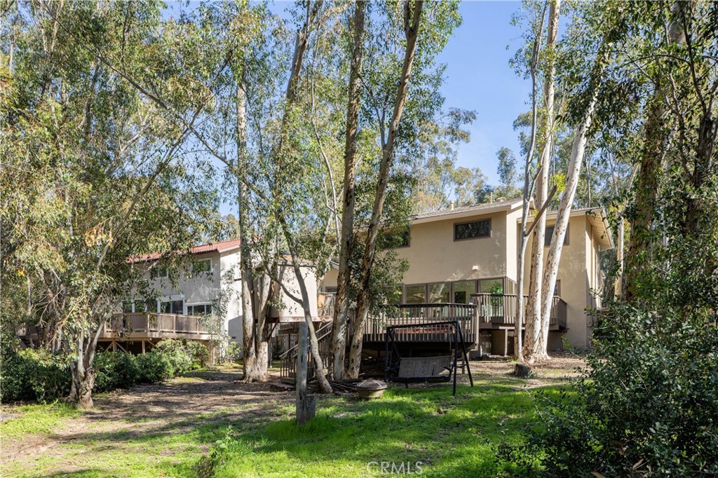 Set beneath a canopy of soaring eucalyptus trees, this beautifully renovated home offers tranquility the moment you arrive. Located in The Woods, one of South Orange County's most distinctive enclaves, shaded streets and oversized lots create a setting that feels transportive, yet you remain just moments from it all. Completed with a long-term lens, the 2025 renovation blends elevated turnkey design with meaningful infrastructure improvements, while preserving the warmth and architectural character that make The Woods so visually distinct. Enter to airy vaulted ceilings and a smooth, open flow throughout the main living spaces. The redesigned gas fireplace serves as a striking focal point, featuring new finishes and remote control functionality for tailored warmth and ambiance. The living room connects to the dining nook and functionally designed kitchen with all new appliances, while an additional dining area and adjoining family room offer flexibility. A full wall of windows brings in natural light through the surrounding trees, creating a true indoor-outdoor feel. Extra-thick luxury vinyl plank flooring, fresh paint, recessed lighting, updated fixtures, fully renovated bathrooms, and all new custom solid core doors elevate the interiors. Newly insulated walls and ceilings, along with energy-efficient, noise-reducing windows and sliding glass doors, enhance comfort and quiet throughout. Upstairs, the remodeled primary suite offers serene treetop views from a private balcony, joined by three additional bedrooms and an updated secondary bath. Outside, an expansive deck with spa and treehouse creates a relaxed retreat. An oversized interior laundry room with storage and direct garage access adds everyday functionality. Behind the design, infrastructure improvements include replaced and expanded electrical with an upgraded panel ready for solar and EV charging, a full PEX repipe, foundation reinforcements, and refreshed landscaping, gutters, and downspouts. Shopping, dining, entertainment, schools, amenities, and everyday conveniences are at your fingertips, including Irvine Spectrum, Great Park, and Lake Forest Sports Park. HOA membership includes access to the Lake Forest Beach & Tennis Club with heated pools, beach lagoon, pickleball, basketball, and event space. A rare opportunity to own a truly turnkey home where timeless character meets renovation depth...this is an opportunity not to be missed.
